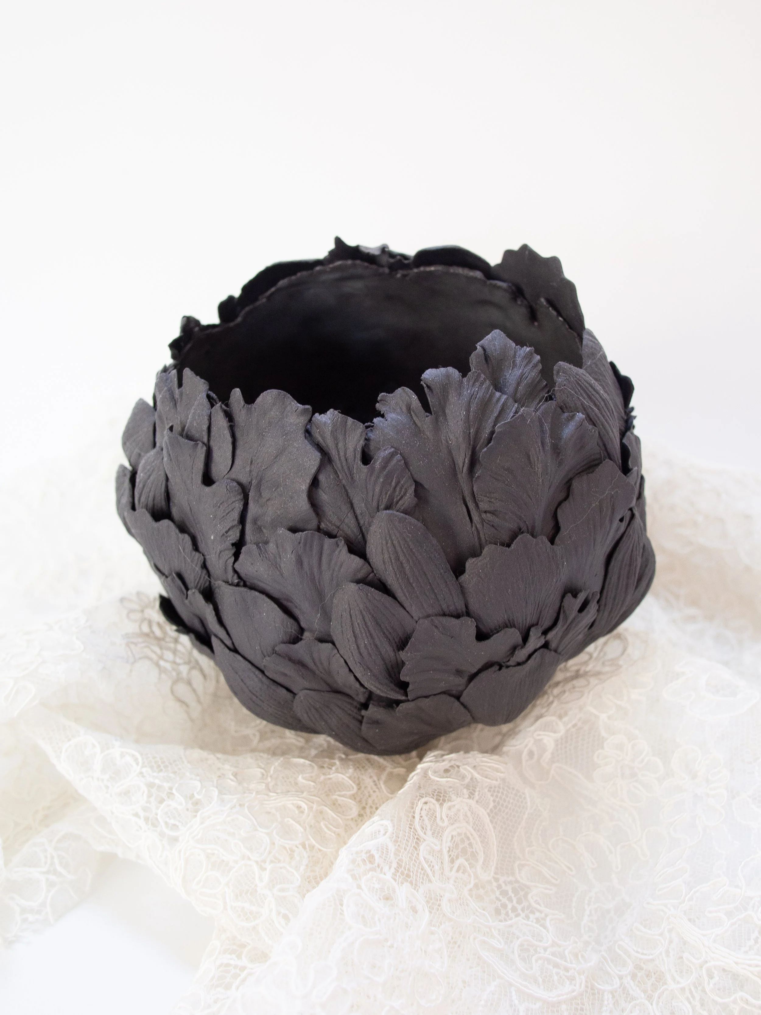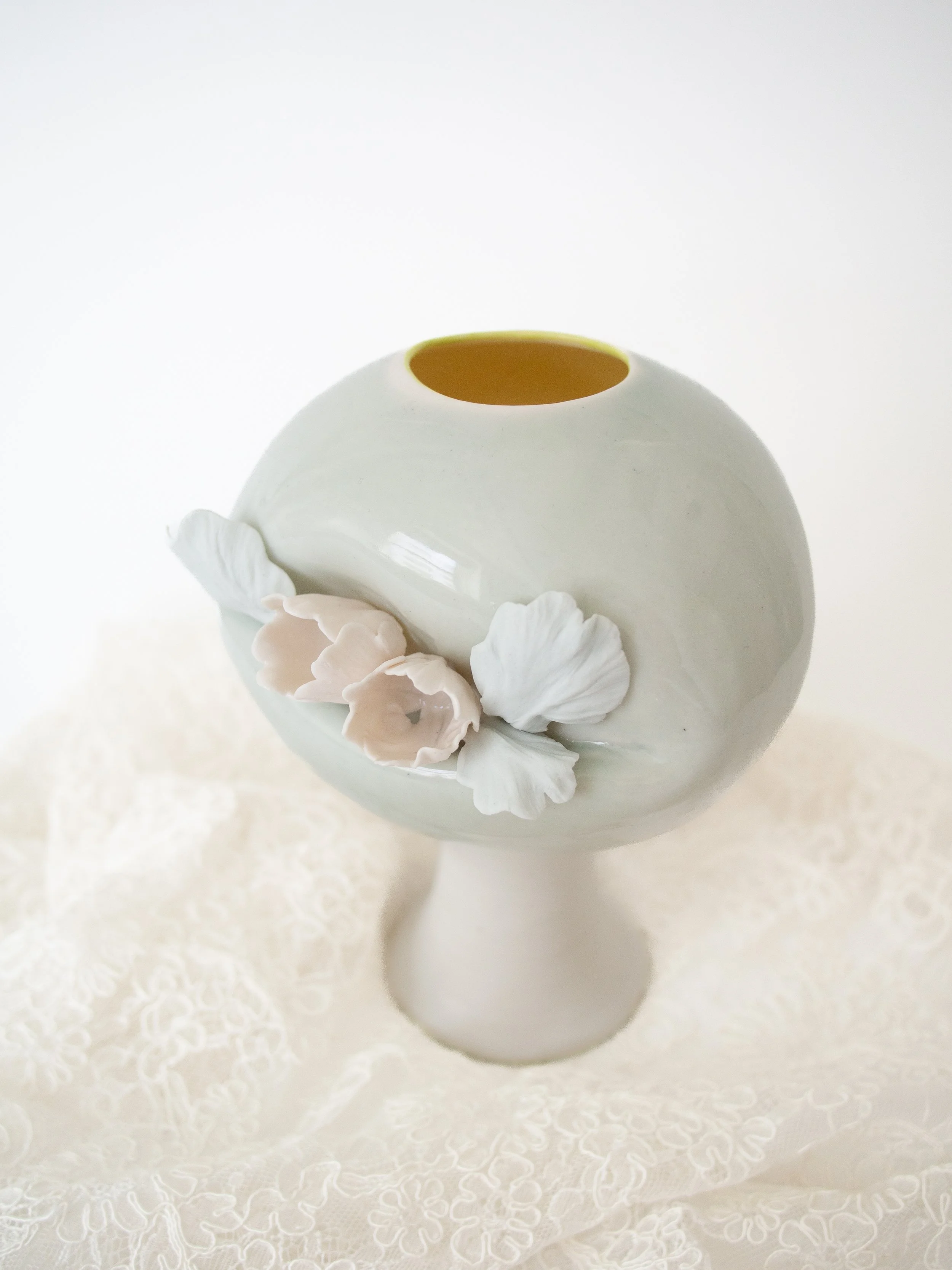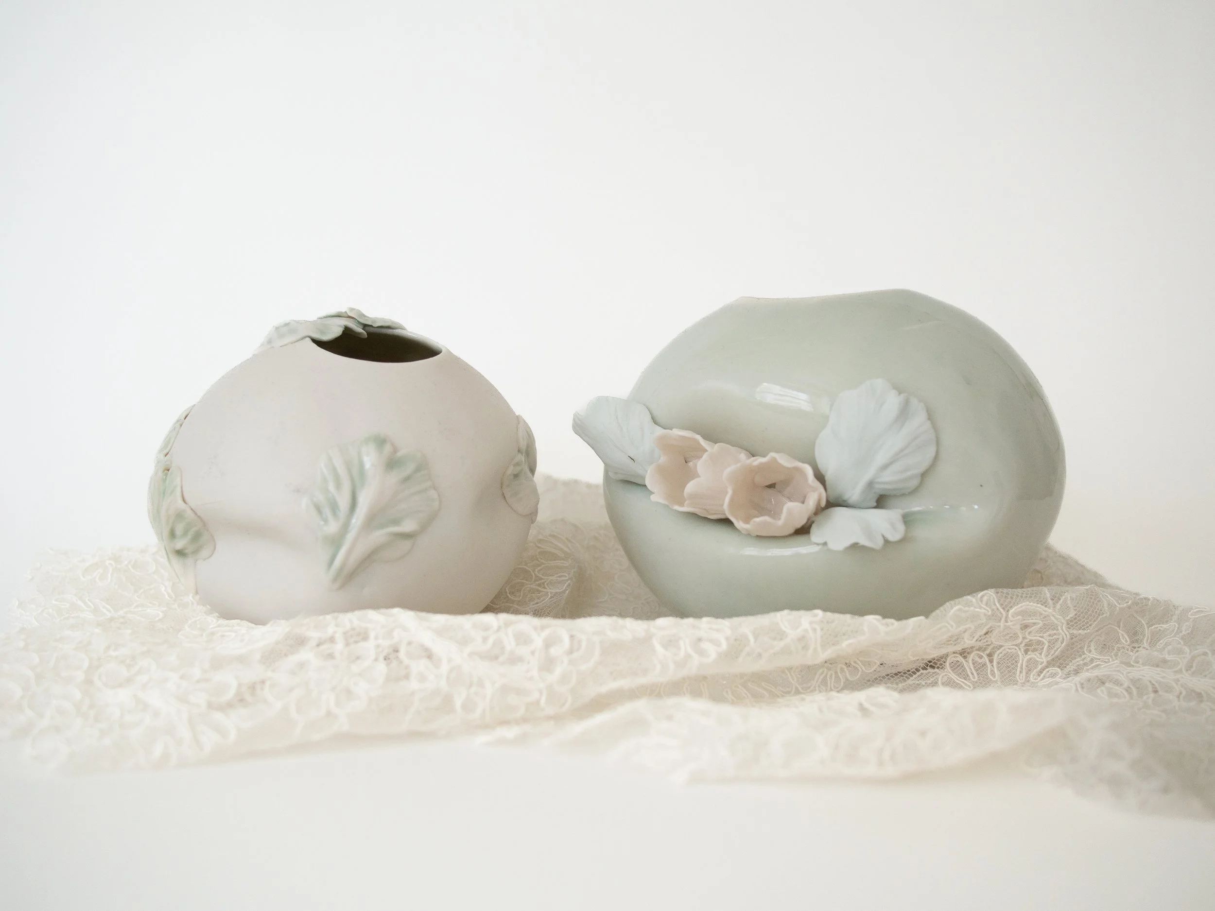 Series of porcelain vessels depicting blooms at various stages of bloom and decay