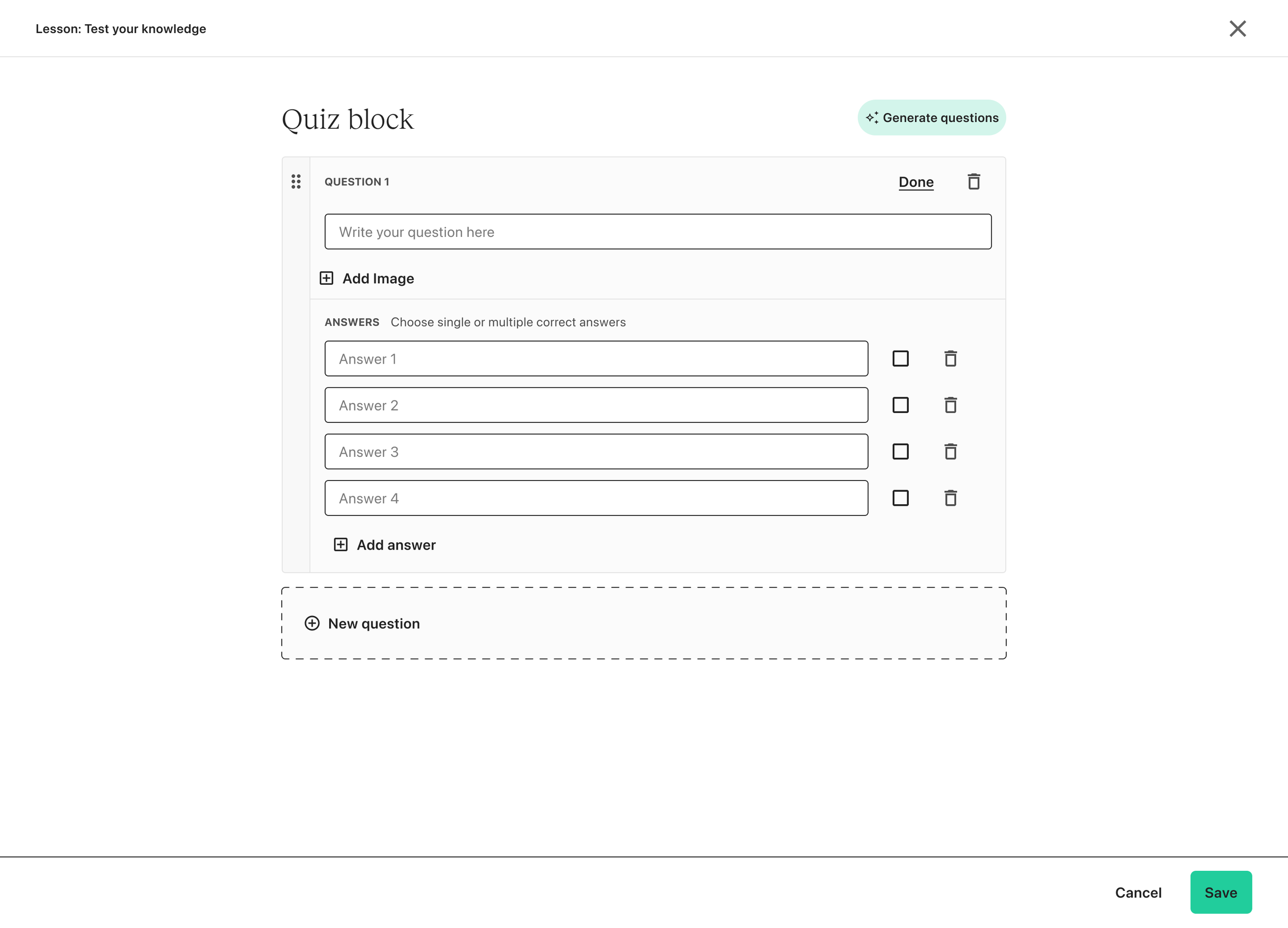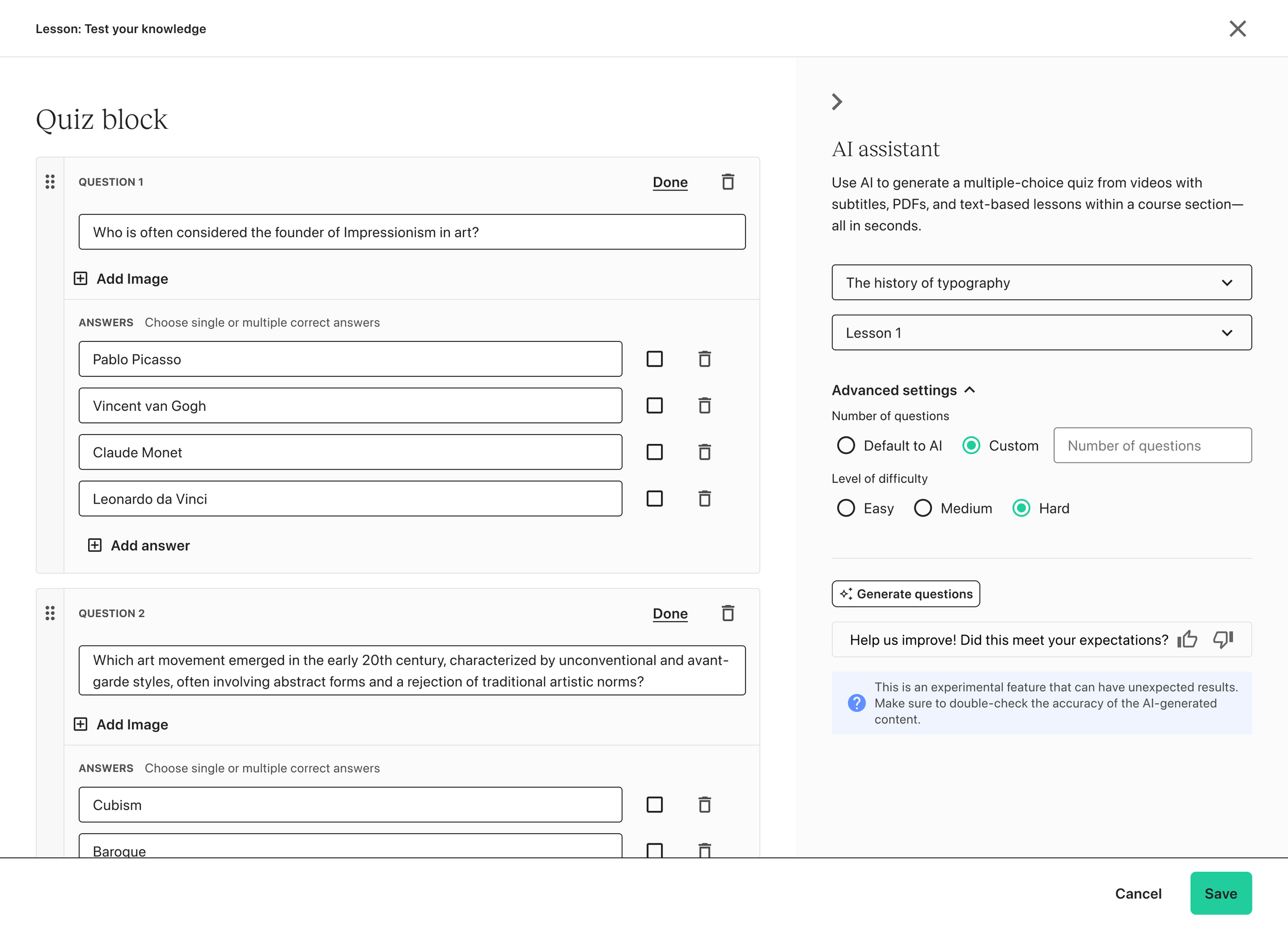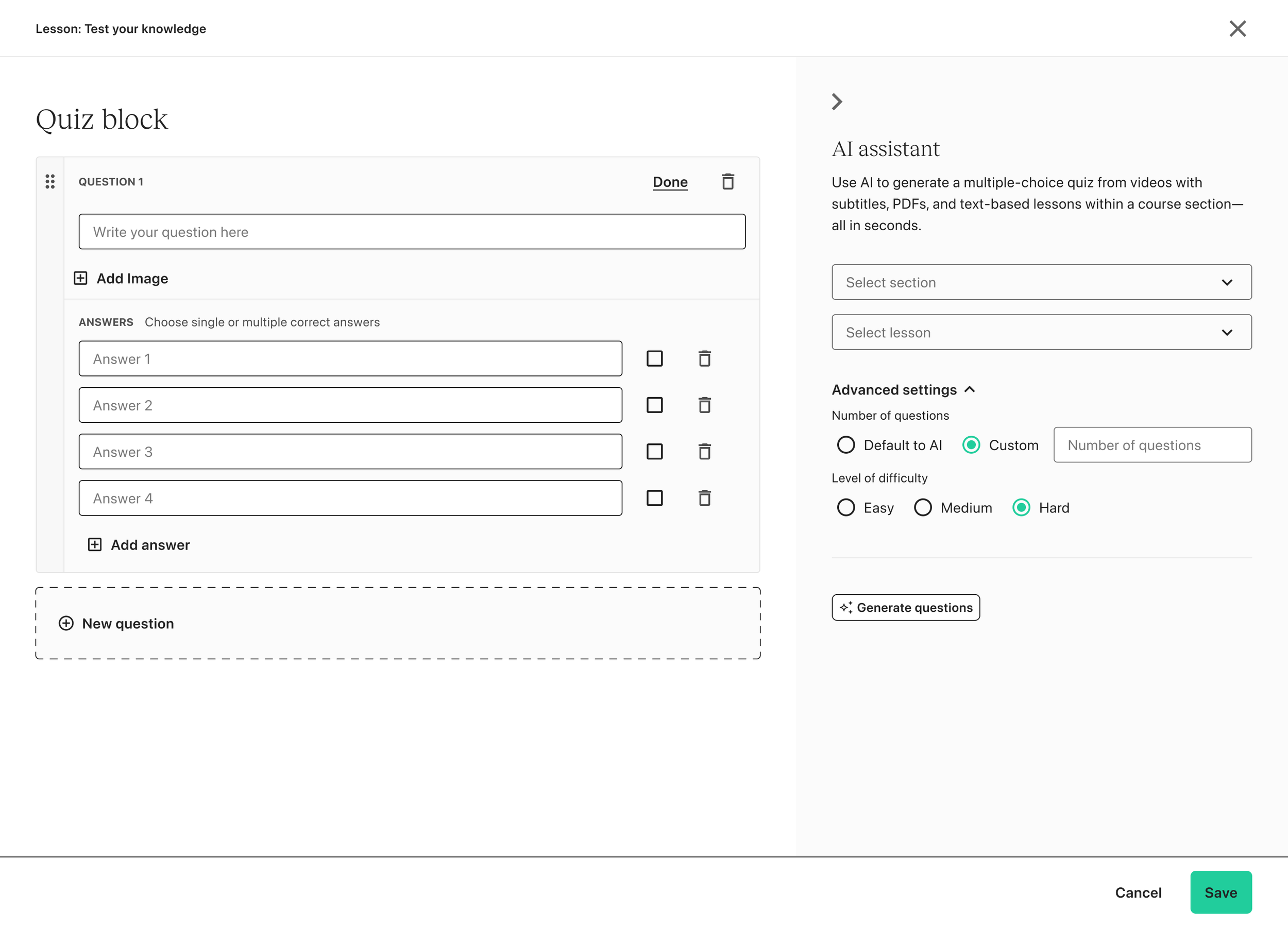 Developing quizzes within a course can be a time-consuming endeavor. I designed a quiz generator that generates multiple-choice questions from a content sections or specific lessons. This involved a complete redesign of the current experience and integration of the AI assistant.