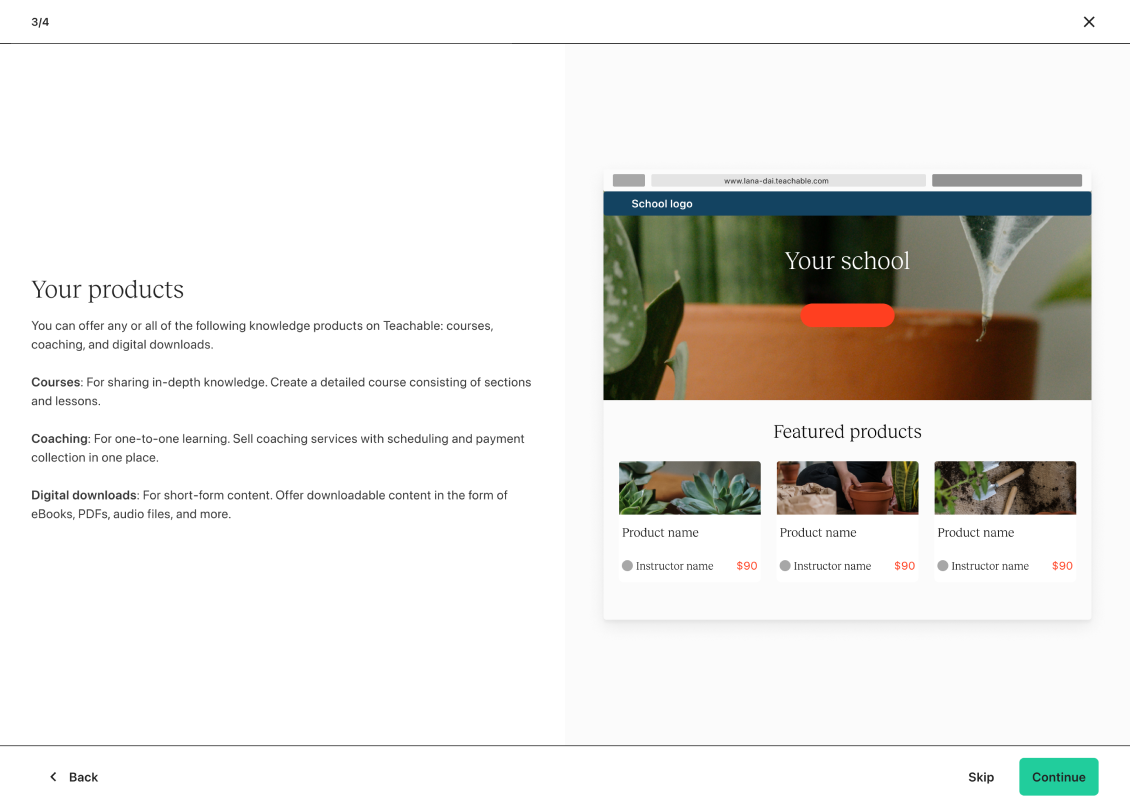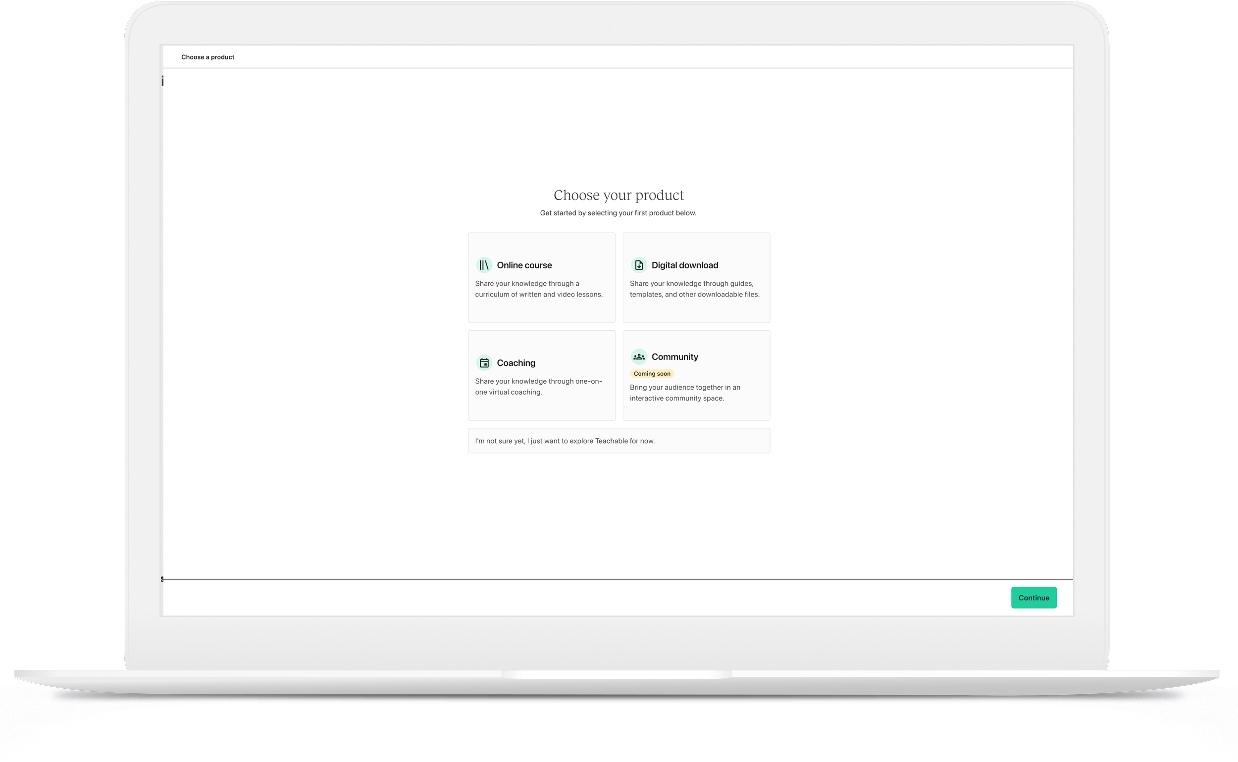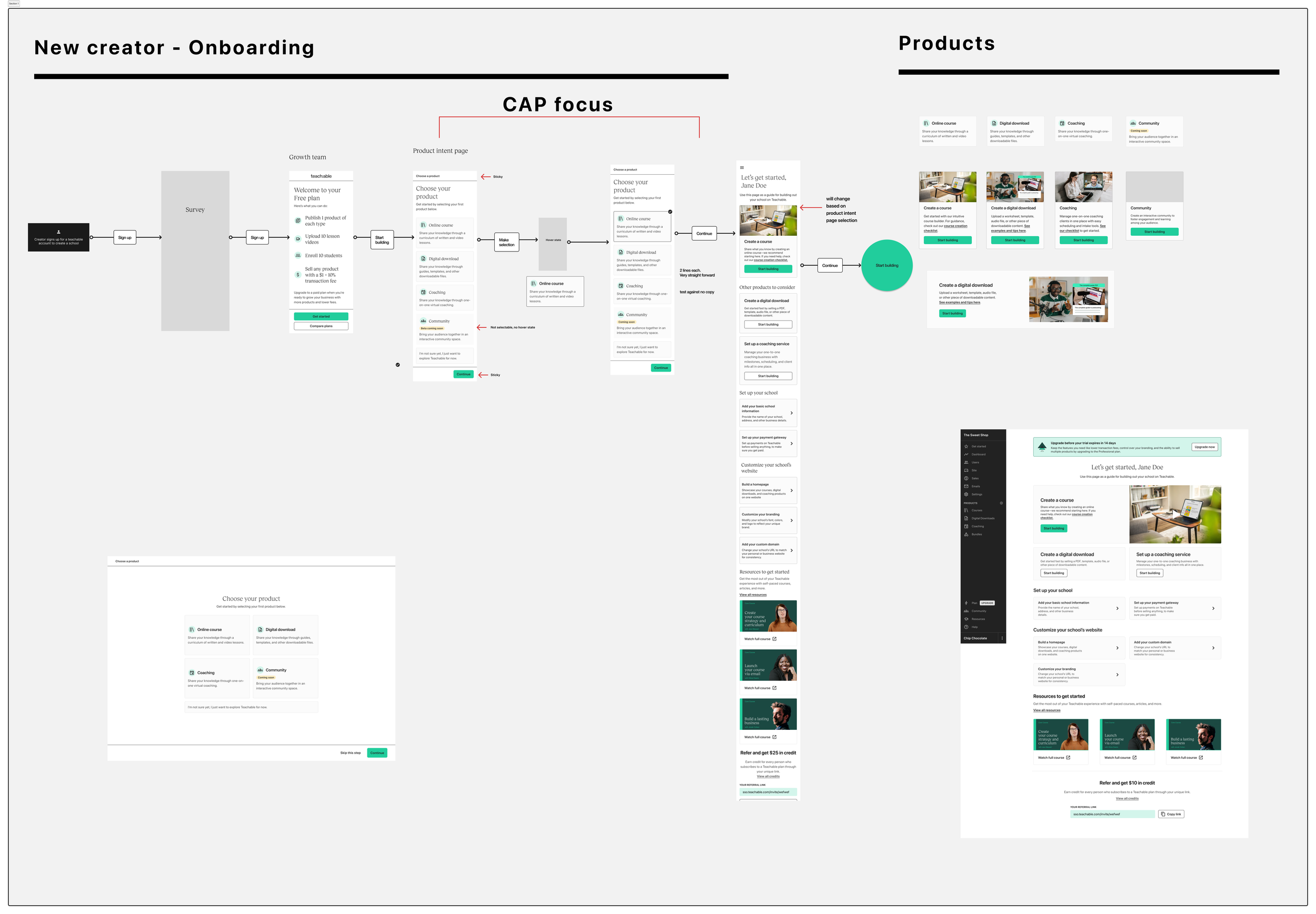 In the first phase of the project, we removed the guided onboarding steps (school setup and education) and introduced a bit of personalization. This is where we ask the user what they wanted to build first. They choose a product and we funnel them into the “Get started” screen but now it reflects the product they’ve selected vs. a course.