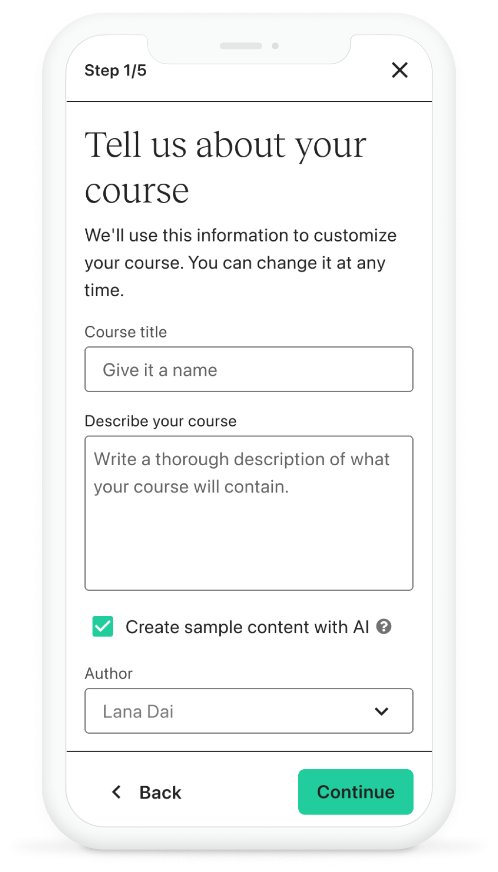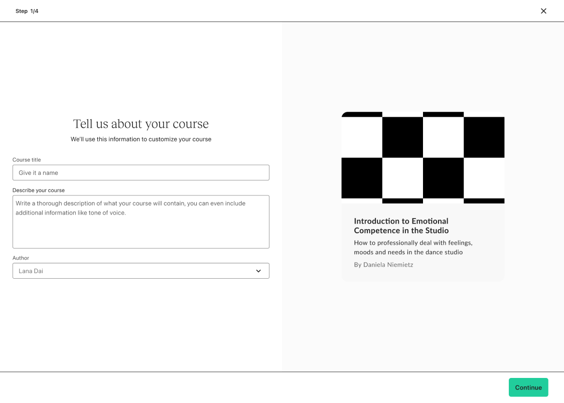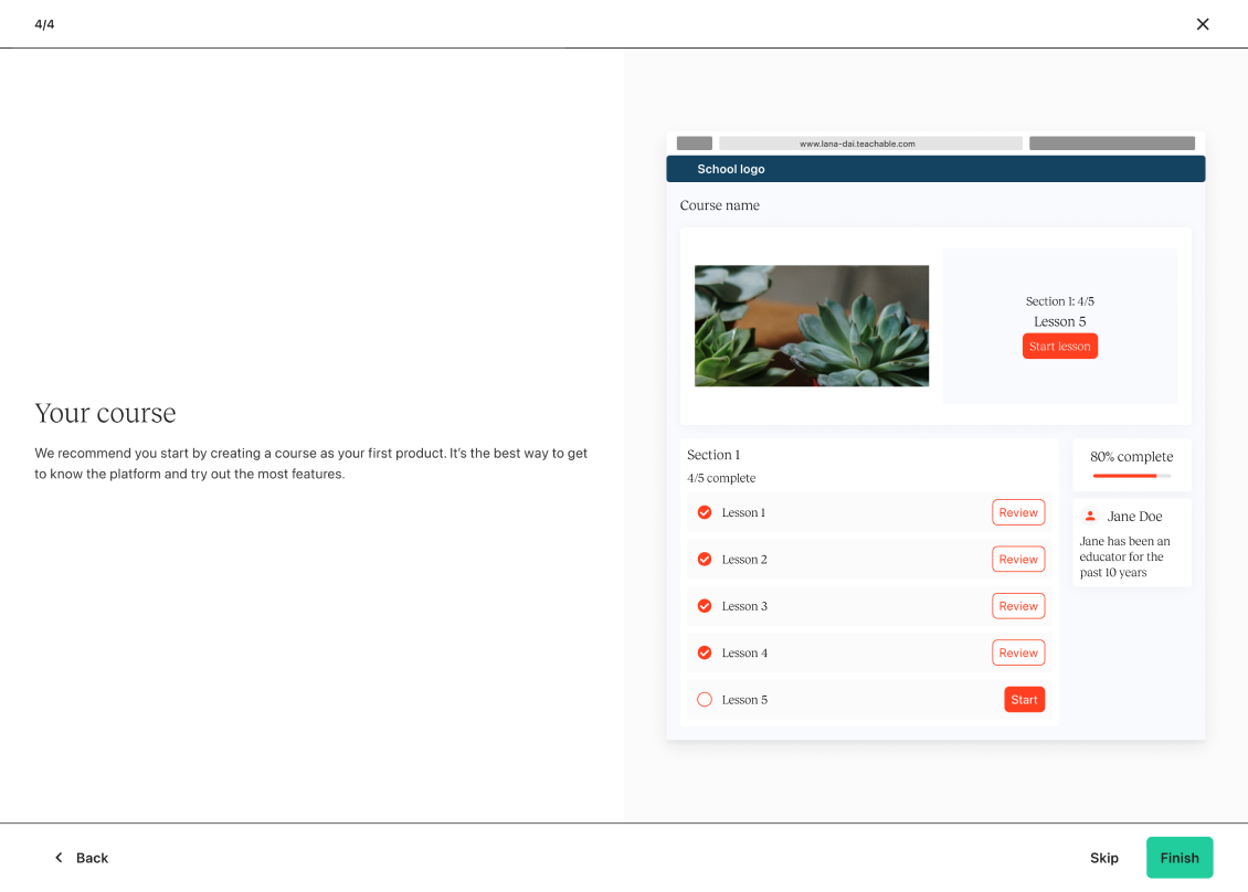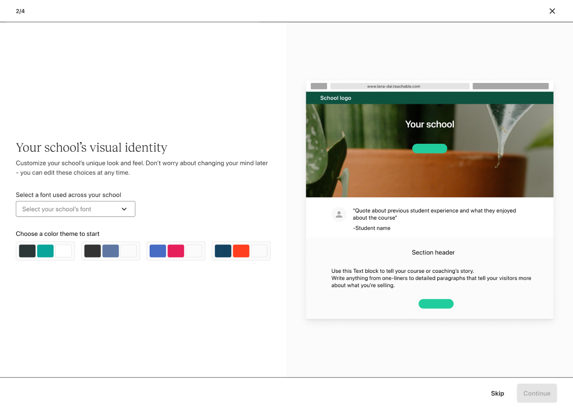 In the first phase of the project, we removed the guided onboarding steps (school setup and education) and introduced a bit of personalization. This is where we ask the user what they wanted to build first. They choose a product and we funnel them into the “Get started” screen but now it reflects the product they’ve selected vs. a course.