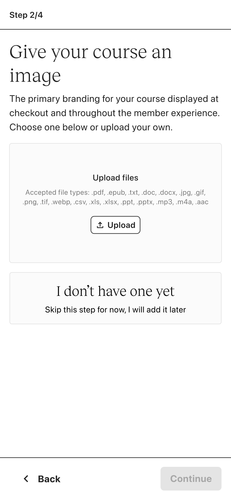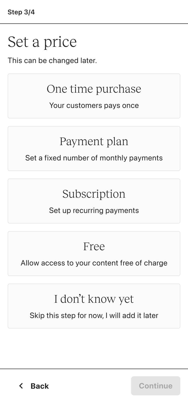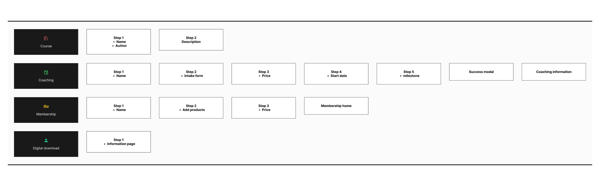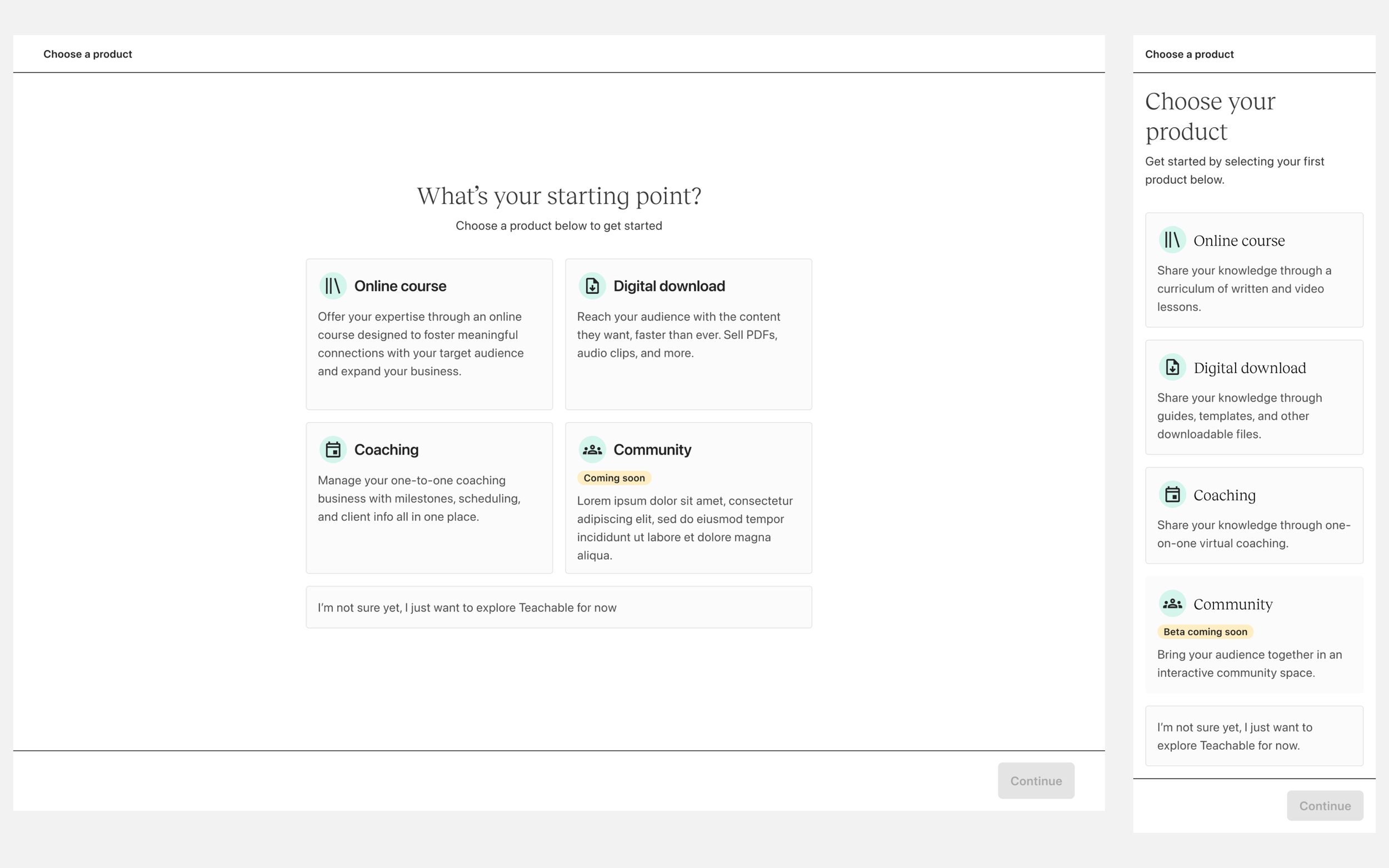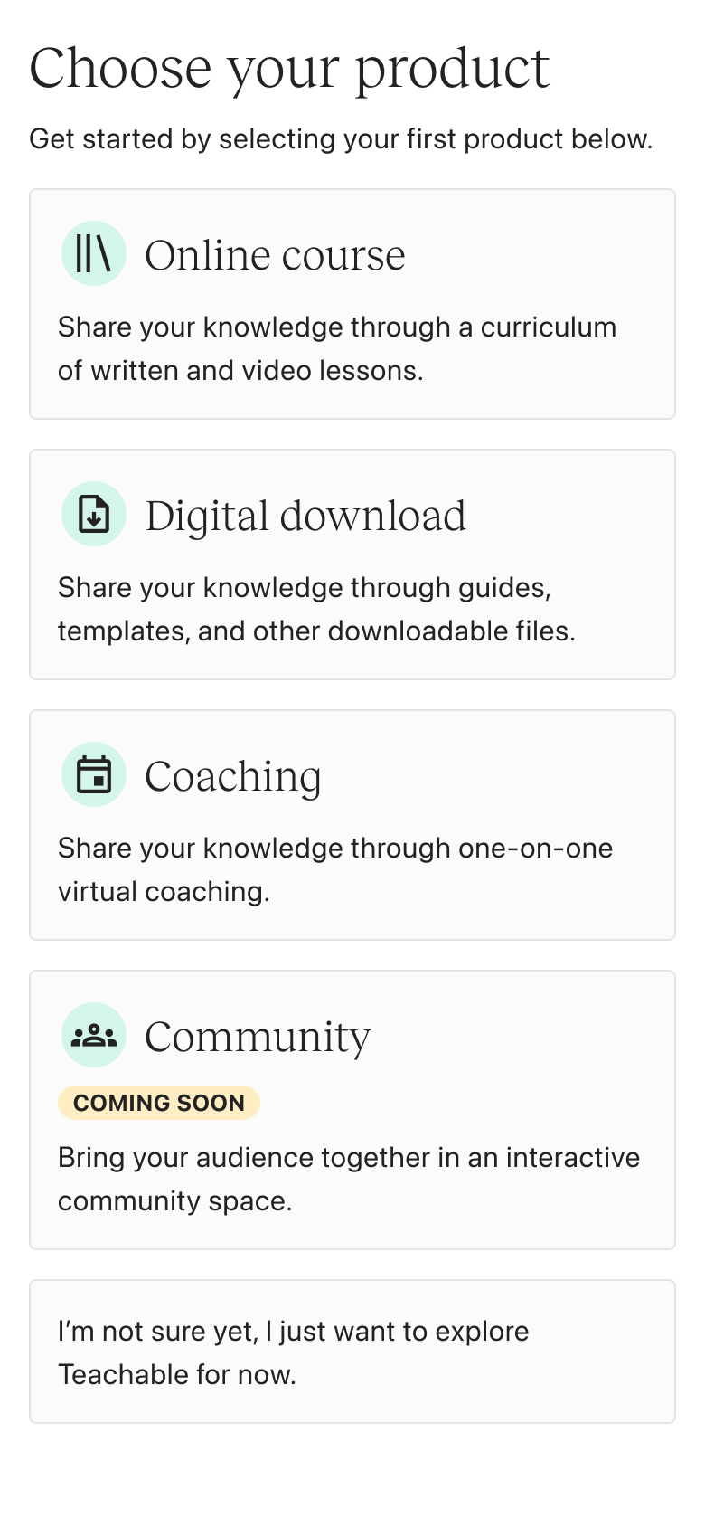 Whether you’re an experienced creator or brand new, the same experience applies. If you intend to create a digital download, coaching sessions or community, you’re first funneled into courses. There is no personalization.
