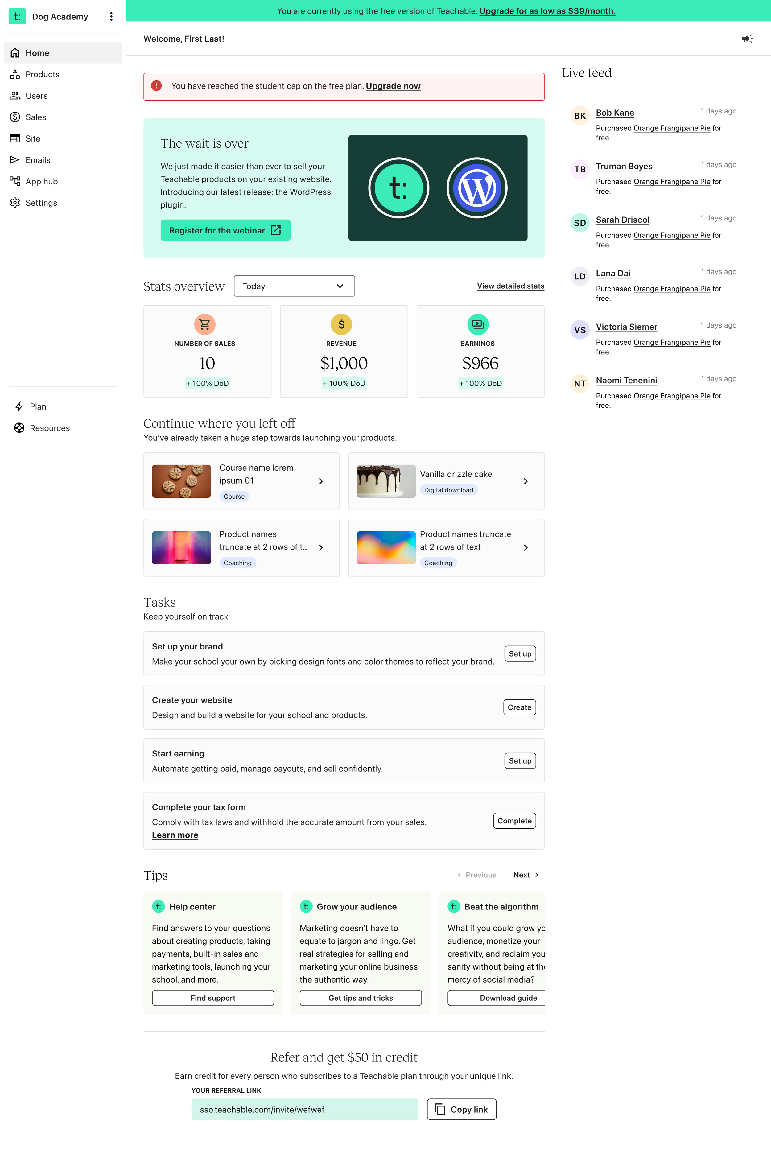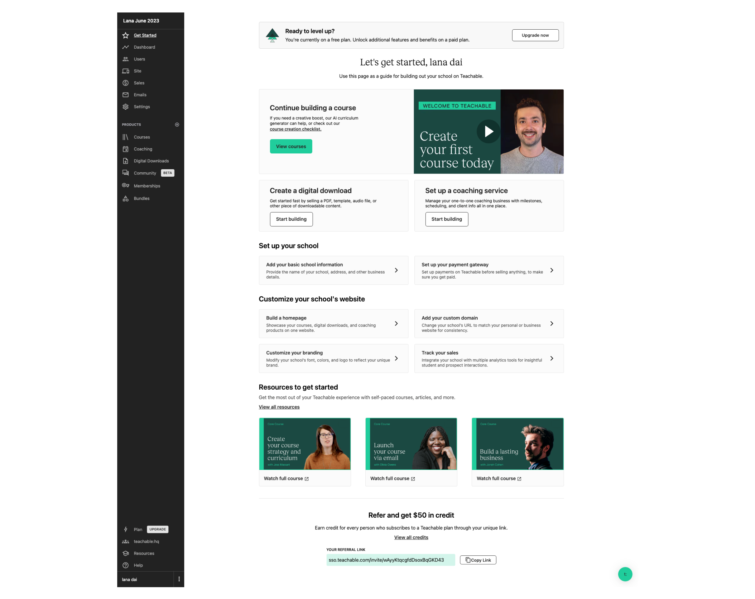 After completing the sign up survey, users get dropped on the “Get started” screen. Since a course was the primary product, we tried to push users to creating a course. However, this meant that users who came to teachable for Digital downloads, coaching, community were left confused and struggled to find their way to those spaces. In addition, only available for Free and Trial plans landed on this page. If you’re a paying user, there’s no access to “Get started”