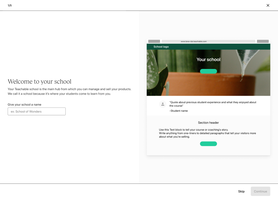 Teachable provided very little guided support to new users when they signed up. The guidance offered was centered on school setup rather than product creation. We’ve known from talk to users that they initially struggled with the concept of a 'school'. Their main focus was on creating a course, making the school concept challenging to grasp at first.