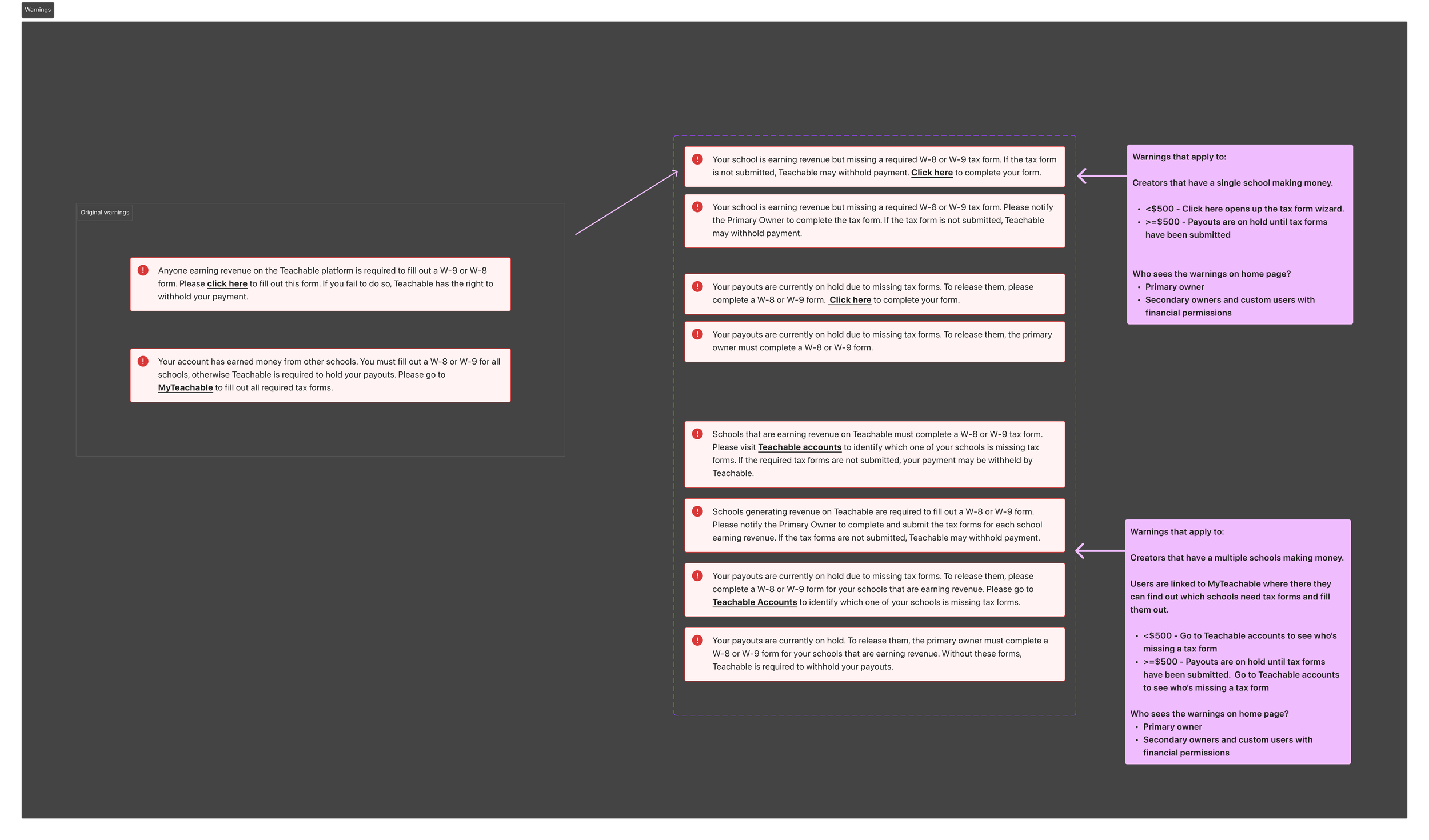 During the home page redesign, one of the more complex challenges we addressed was related to tax form warning messages. These messages are based on a set of intricate rules, depending on the user and their earnings. Previously, there were only two generic warning messages, which didn’t effectively communicate the issue, leading to frequent customer support inquiries. Collaborating with the commerce, finance, and customer support teams, I redesigned the warning system to provide more specific, clear messages tailored to the appropriate user. Although the number of warning messages increased, only one is shown at a time. Now, messages are distinct for primary vs. secondary owners and clearly explain why payouts are on hold, with the goal of reducing confusion and support requests.